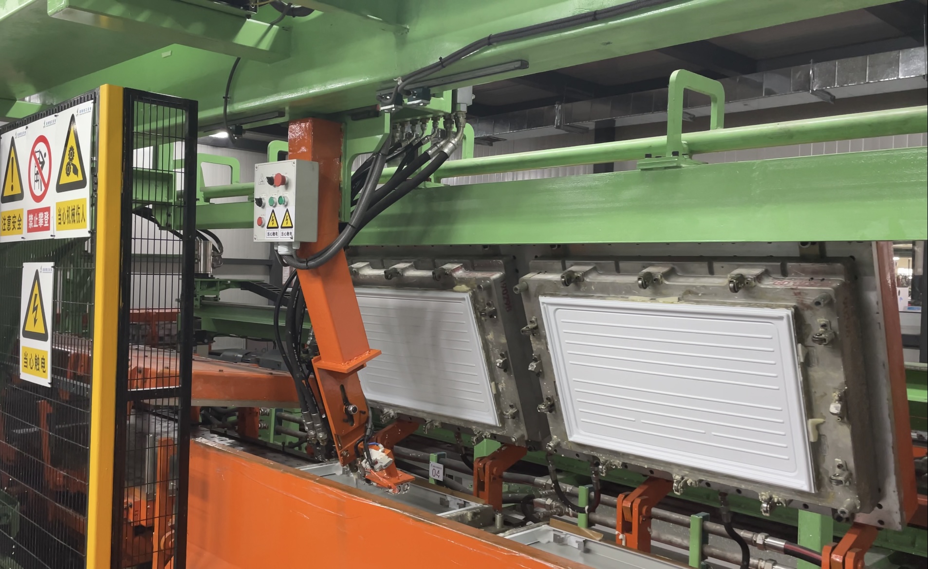 全自動(dòng)冰箱門體發(fā)泡生產(chǎn)線屬于環(huán)形式門體發(fā)泡生產(chǎn)線,為水平地面環(huán)形結(jié)構(gòu)布置,采用自動(dòng)澆注,自動(dòng)取件,可不停線生產(chǎn)各種不同型號(hào)的冰箱門體的發(fā)泡,多種產(chǎn)品可在線上混線生產(chǎn),線體運(yùn)行速度可自行調(diào)節(jié),大大提高生產(chǎn)節(jié)拍,其中鏈輪驅(qū)動(dòng),機(jī)械開模,機(jī)械合模的穩(wěn)定結(jié)構(gòu),減少了設(shè)備的故障率。
